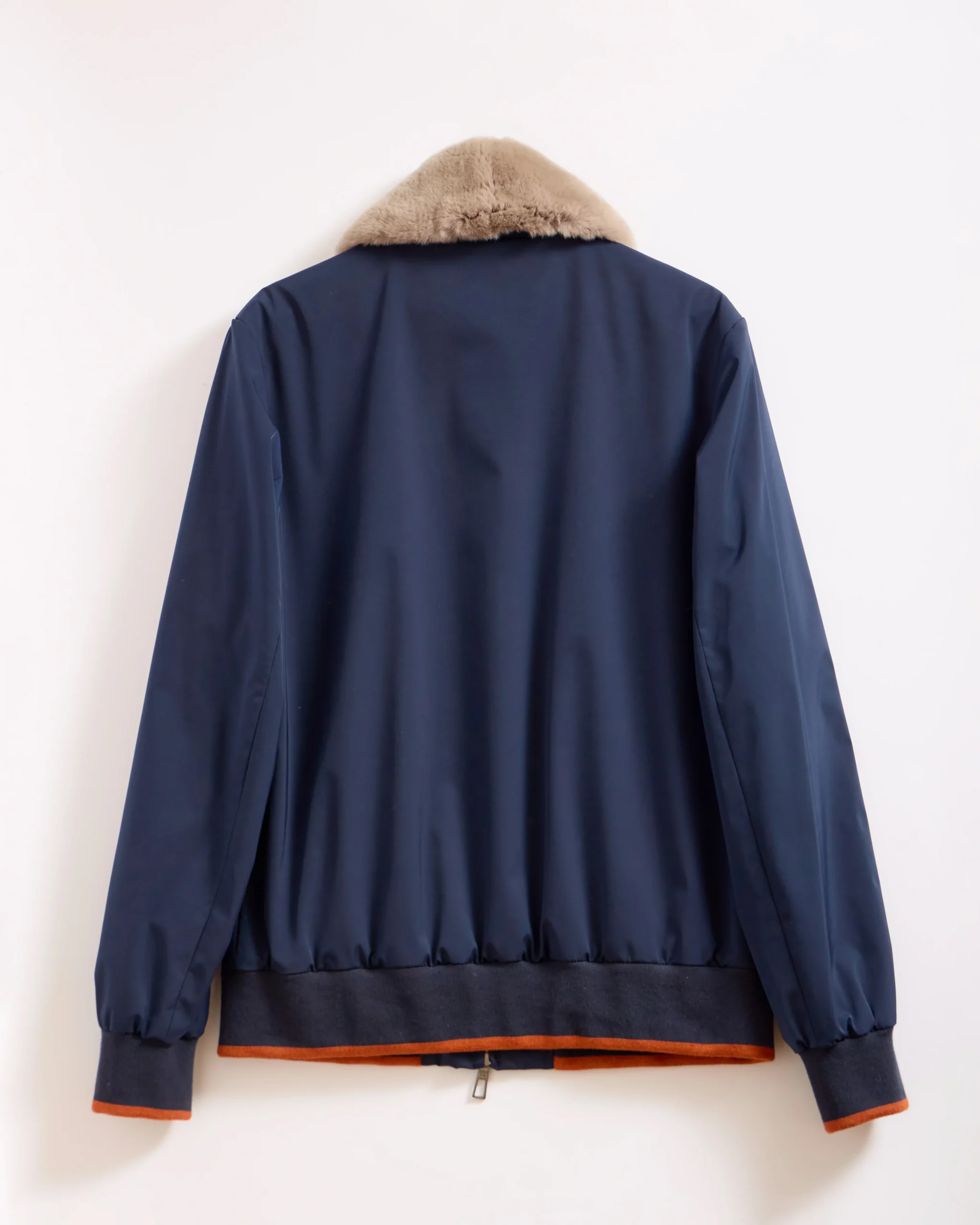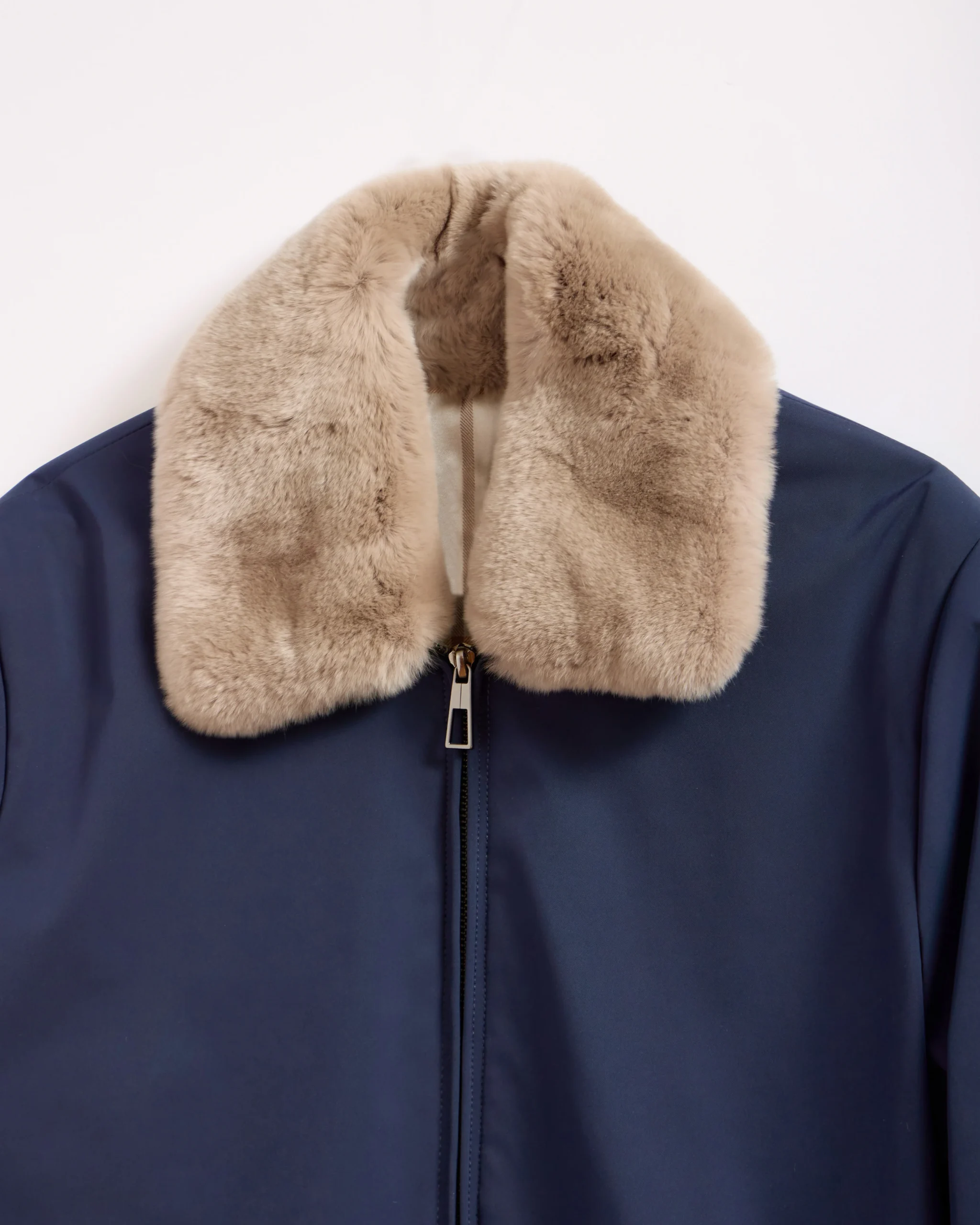Its deep navy tone brings a quiet sophistication that pairs effortlessly with both casual and elevated looks. Featuring a full front zip, long sleeves, and two side pockets, the design is streamlined, functional, and inherently elegant.
