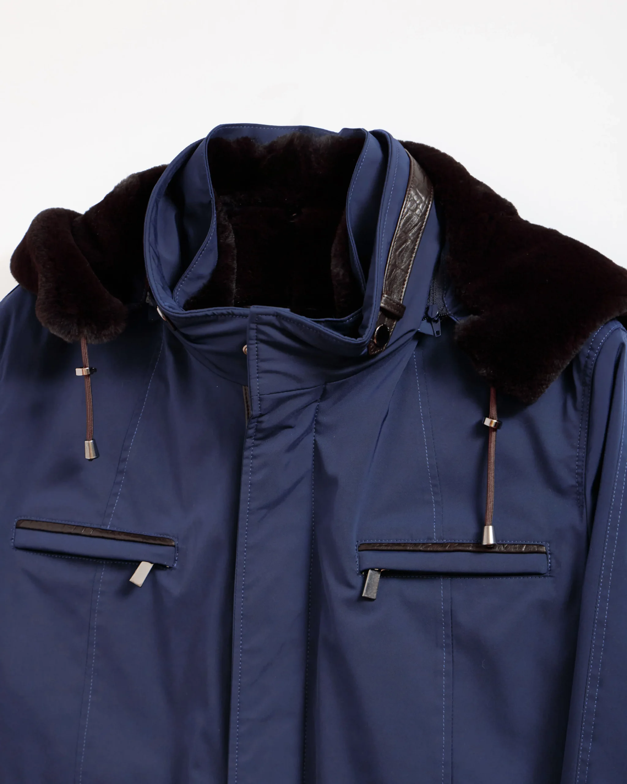 Its timeless navy blue color exudes elegance, perfectly suited for a variety of occasions. Distinctive croco leather accents add a luxurious and unique touch to the design. Featuring a front zip closure, full sleeves, five practical pockets, and an attached hoodie, the Hamad Seaview Luxe keeps you warm, stylish, and ready for any adventure.