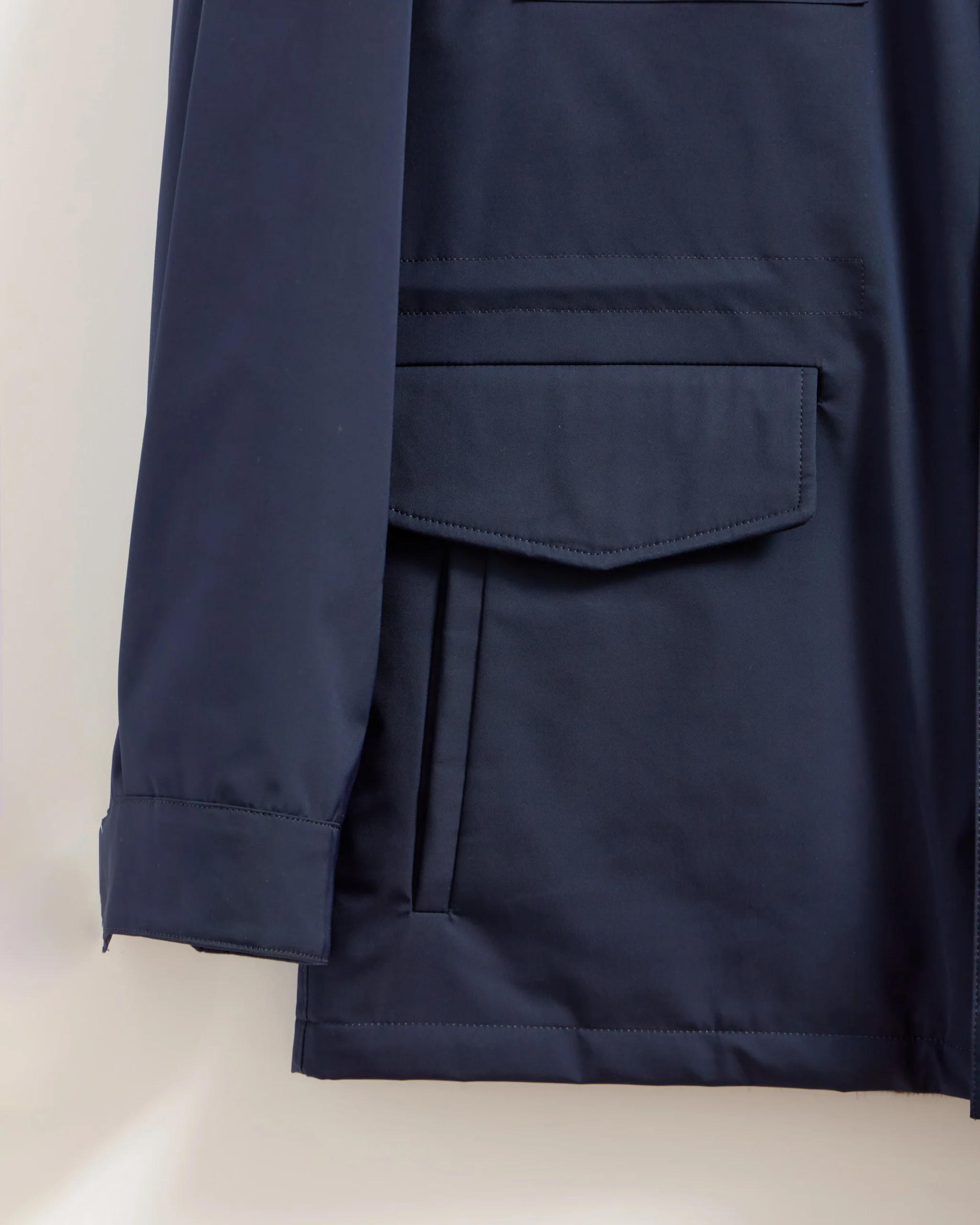 يتميز بلونه الأزرق البحري العميق الذي يضفي مظهرًا خالدًا وأنيقًا، مما يجعله قطعة متعددة الاستخدامات تناسب أي خزانة ملابس. مع سحّاب أمامي، أكمام كاملة، وأربعة جيوب أمامية، يجمع هذا الجاكيت بين العملية والأناقة الراقية.